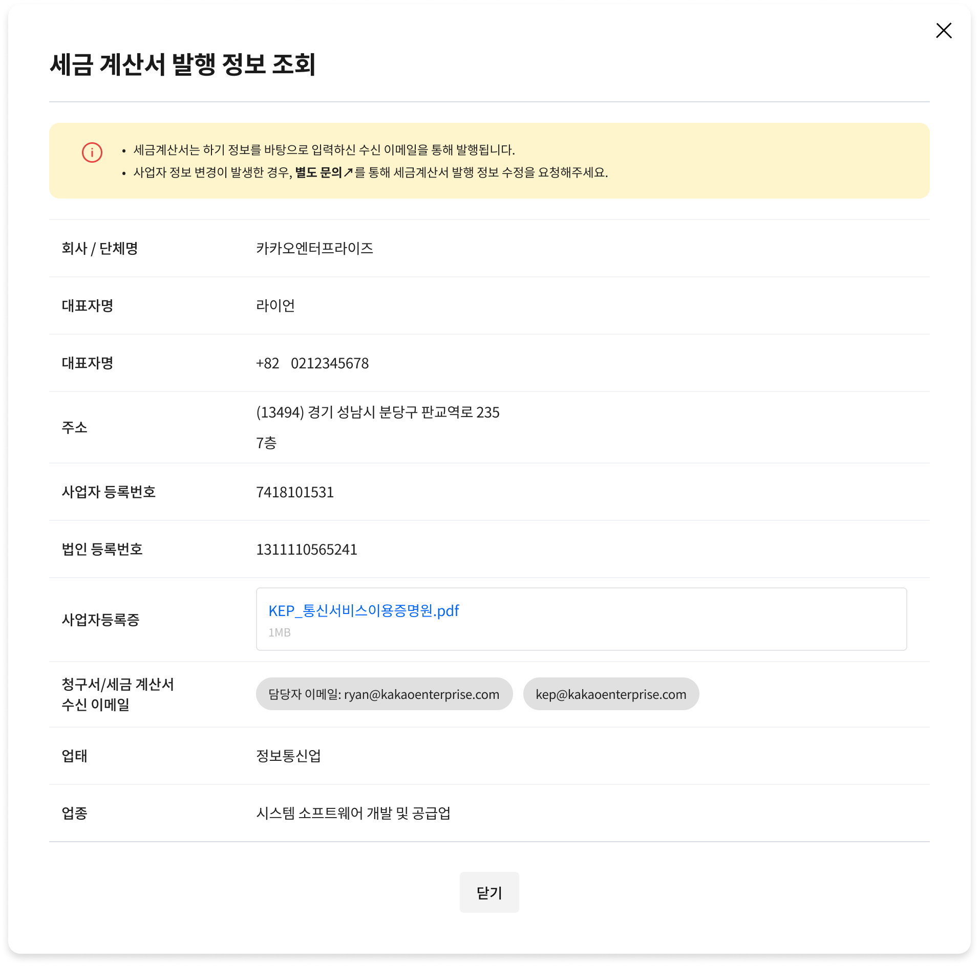 [세금 계산서 발행 정보] 버튼을 클릭하여, 세금 계산서가 발행되는 사업자 정보를 조회할 수 있습니다.