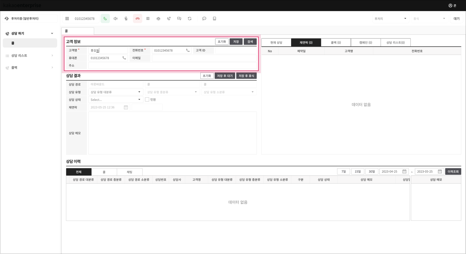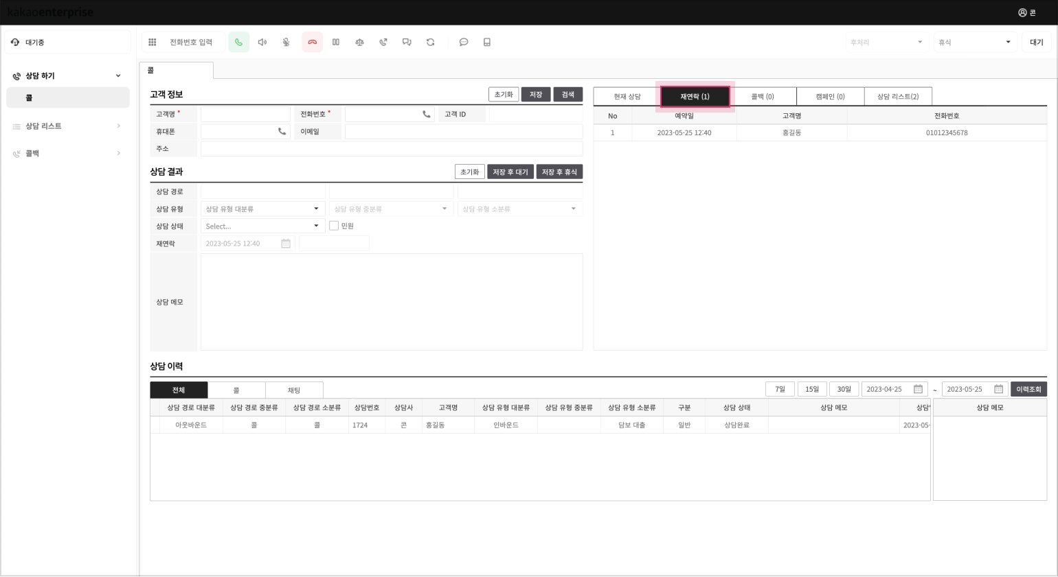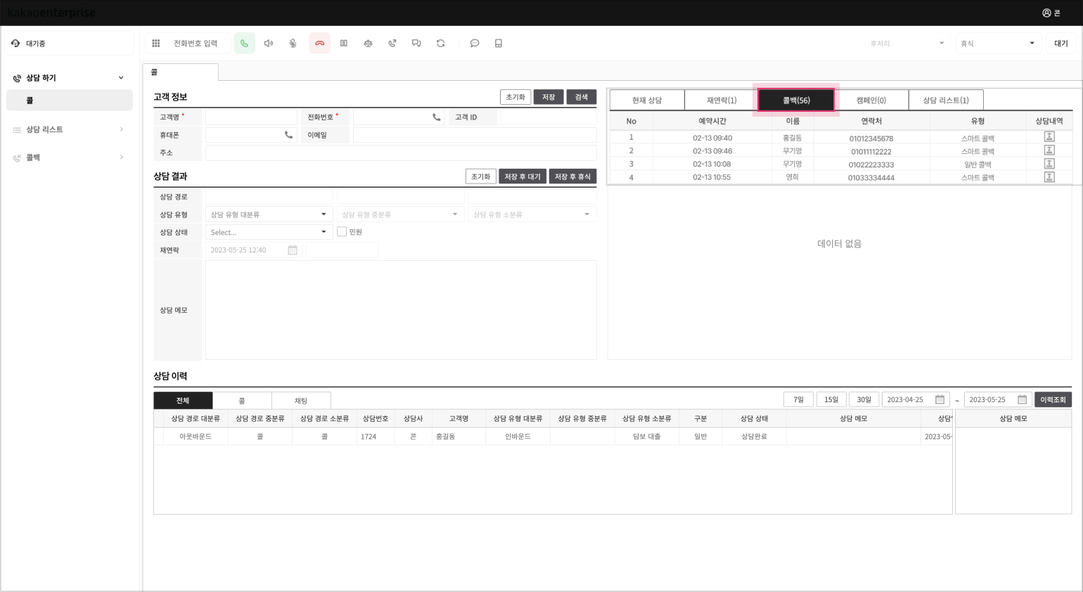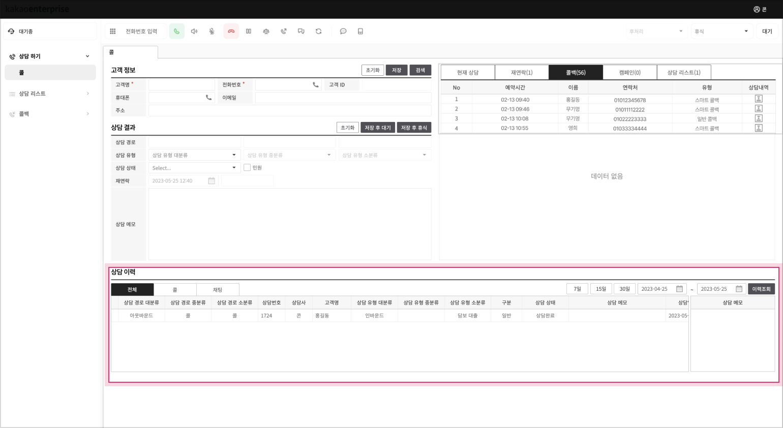 콜 상담(인바운드/아웃바운드)을 진행하고 콜 상담 결과를 저장