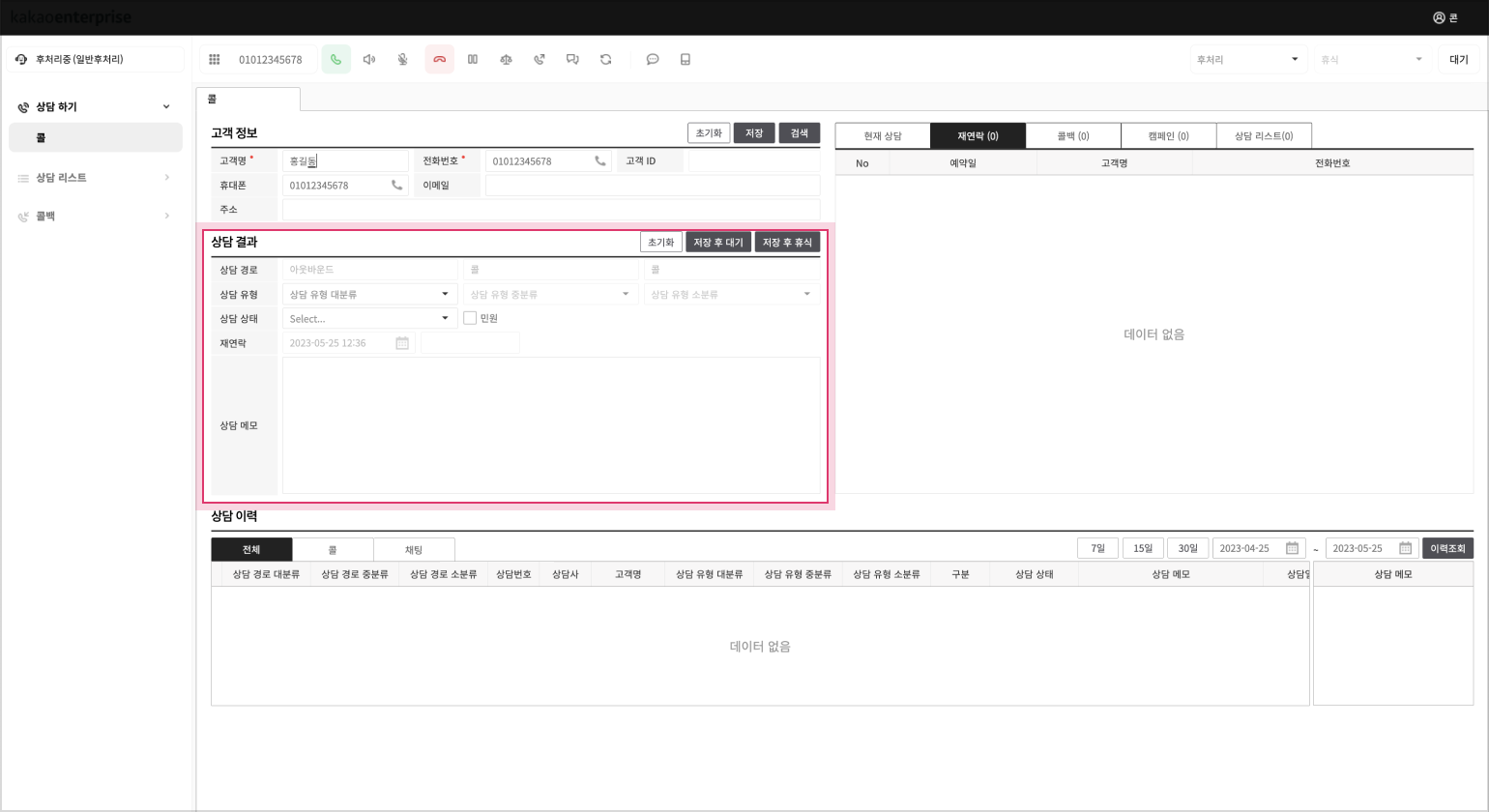 상담 애플리케이션에서 전화 상담이 종료(통화 종료)된 이후에 상담 결과를 저장할 수 있습니다.