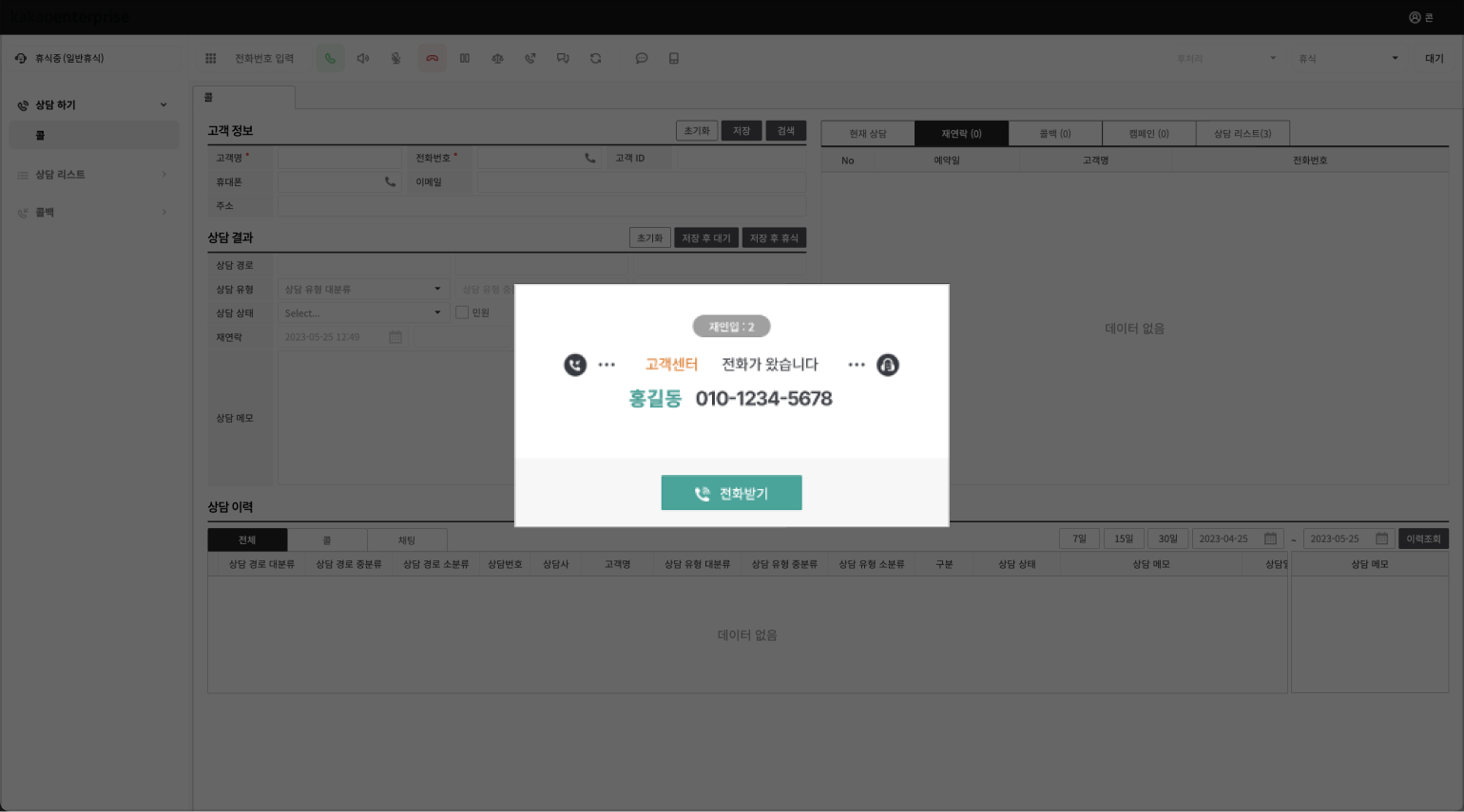 상담 업무를 위한 페이지로 상담전화를 수신하고 상담 내역을 저장하고 필요에 따라 고객에게 상담전화를 발신할 수 있습니다.