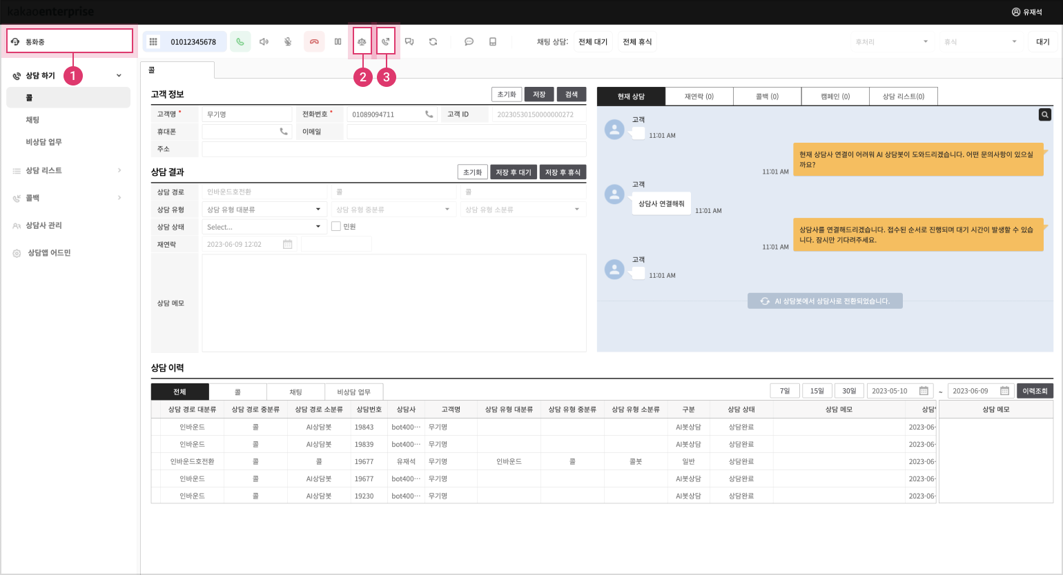 인바운드 상담 전화를 통한 상담 업무를 바로 진행할 수 있는 콜 메뉴입니다.