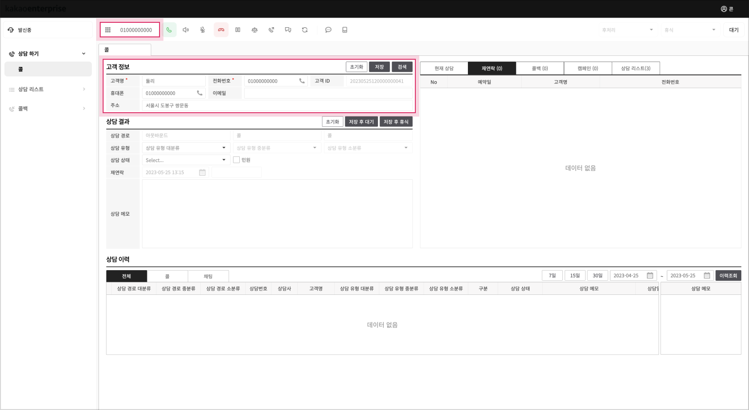 기존에 등록된 고객 전화번호 발신을 시도할 경우 발신과 동시에 고객정보란에 해당 고객의 정보가 자동으로 표시됩니다.