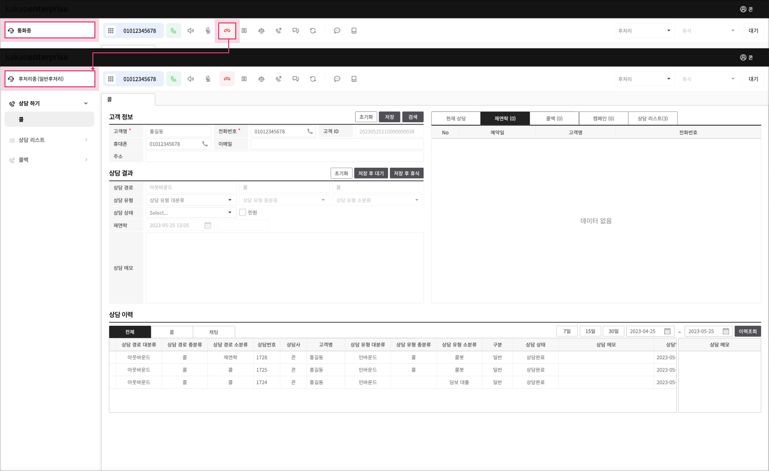 상담 통화 종료 시 상담사 상태는 통화중에서 상담 내역을 저장할 수 있는 후처리 상태로 자동 전환됩니다.