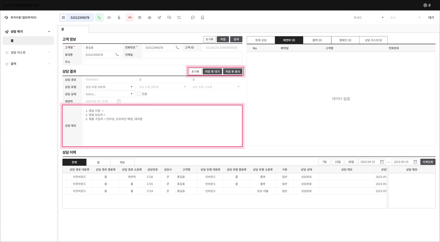 상담 통화를 완료(호 종료)시 상담사 상태는 상담 결과 저장을 위한 “후 처리” 상태로 자동 변경됩니다.