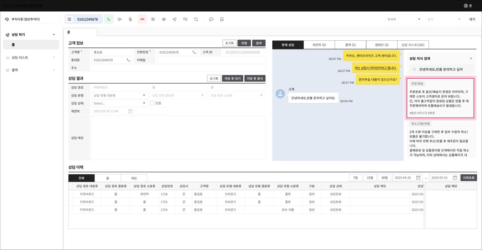 상담 지식 검색의 데이터는 콘솔의 지식 검색 설정에서 등록 가능합니다.