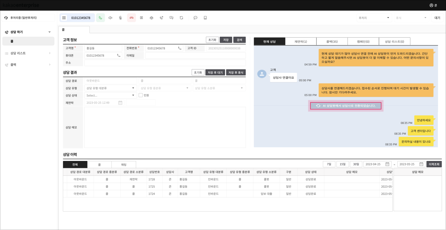AI 상담봇에서 상담사로 호전환된 경우, “AI 상담봇에서 상담사로 전환되었습니다”라는 문구 노출과 함께 고객과 AI 상담봇의 상담 내역이 현재 상담 탭의 상단에 노출됩니다.