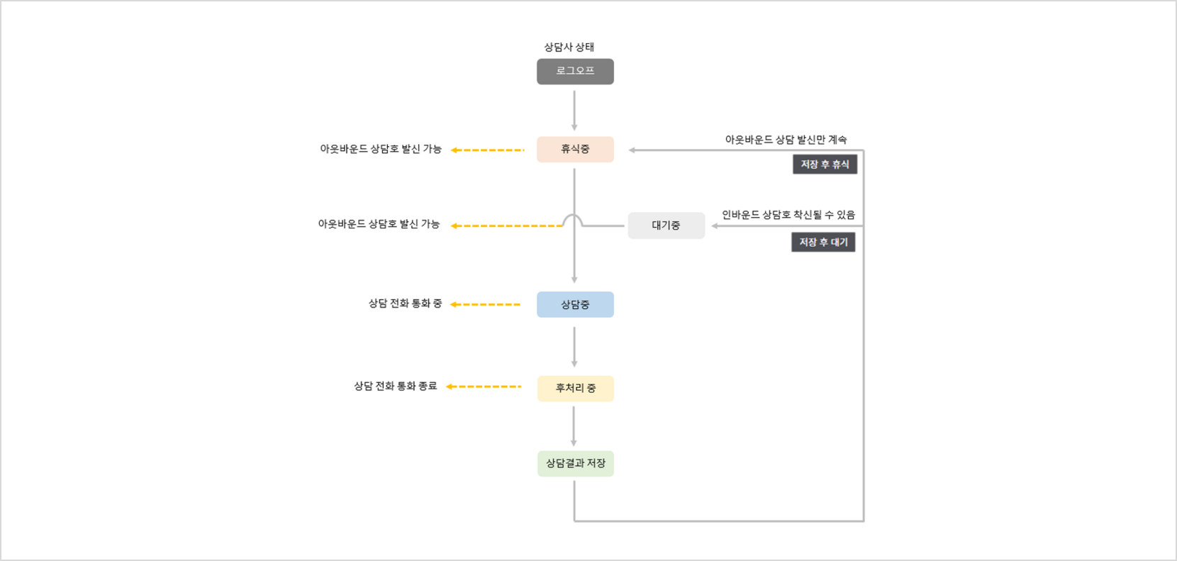 인바운드 상담호는 “대기 중”에만 수신이 가능합니다. ( 아웃바운드 상담호 발신은 “대기 중” 또는 “휴식 중”에서도 가능)
