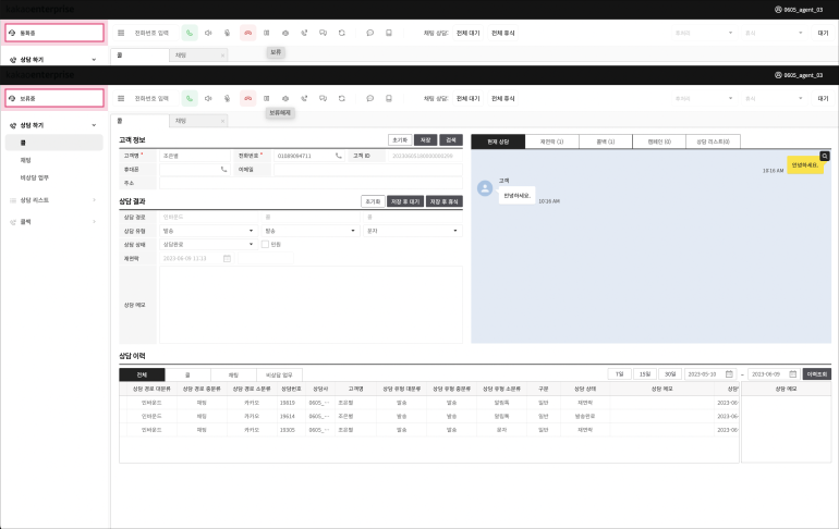 호 전환을 완료한 상담사1은 고객과 통화 종료가 되고 상담 이력 저장을 위한 후처리 상태로 전환됩니다.