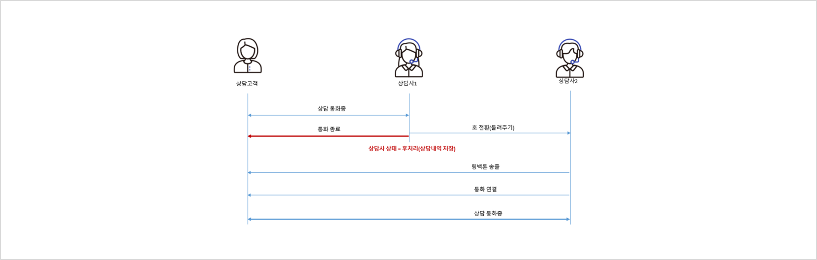 상담사1에서 협의 전환을 요청하고 호를 종료하게 되면 상담 결과 저장을 위한 “후처리” 상태로 변경이 되고 상담 고객과 상담사2간에 상담 통화가 연결됩니다.